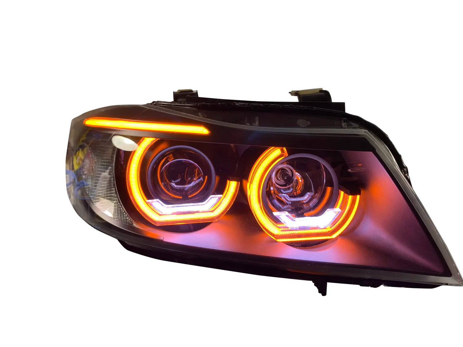 The OEM ring setup on your old E90 LCI headlights suffers from very old technology which results in uneven rings where the inners are brighter (and not very bright to begin with) than the outers, and they are also an unsightly yellow which makes the car look very old and dated. Our LED ring and brow retrofit solves all of that as they feature the brightest rings on the market in a very modern 6k white color!