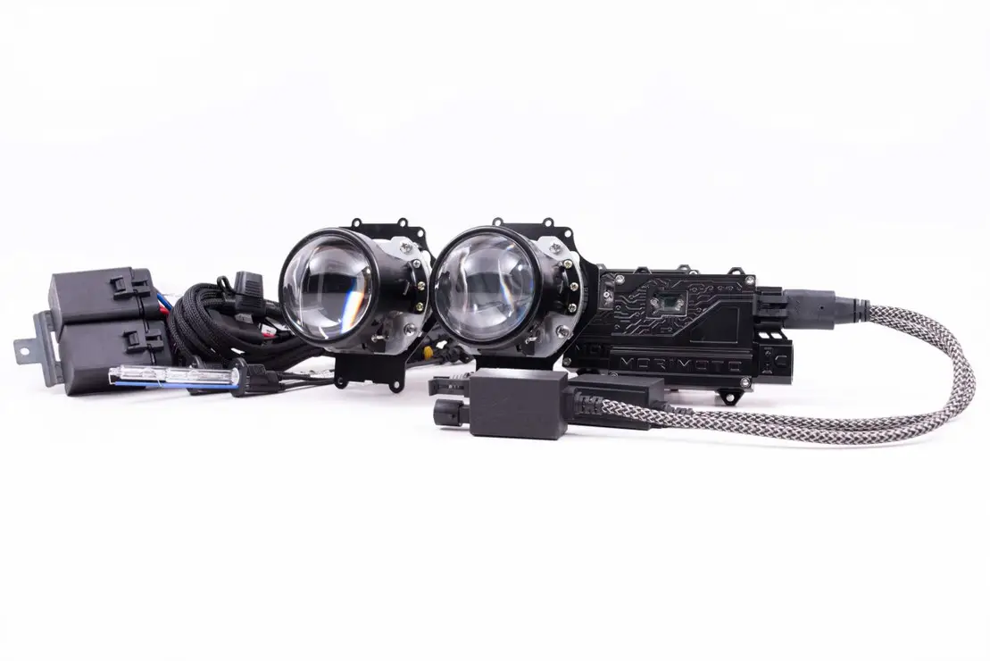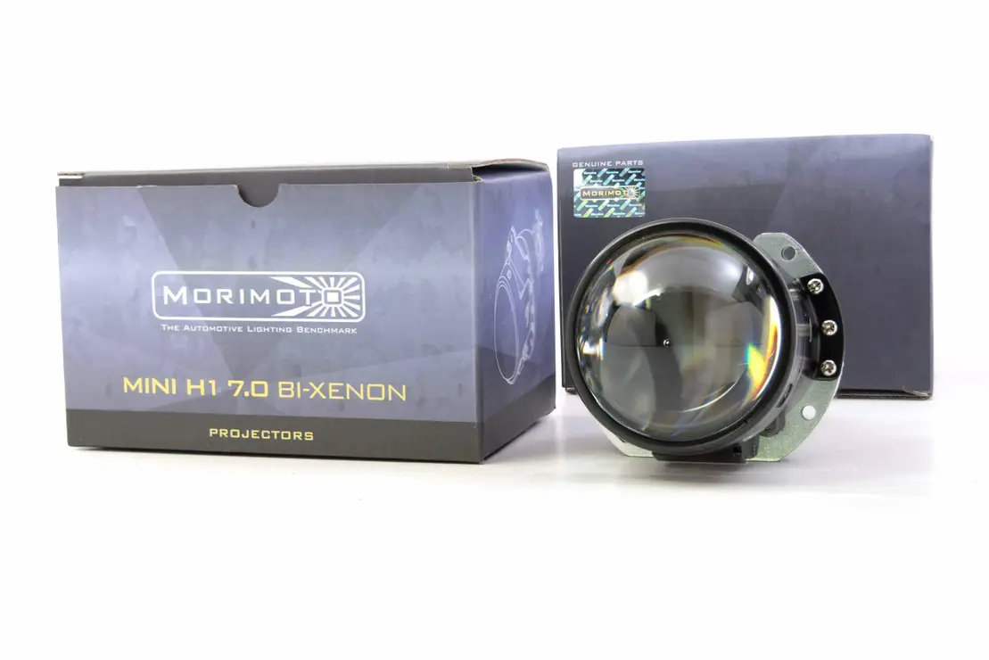 Bi-Xenon Projectors:Â Morimoto’s most modern bi-xenon, the Mini H1 7.0, was an instant winner upon launch. Representing the first full overhaul of the Mini H1 since way back when the 1.0 came out, it’s now one of the most advanced headlight projectors in the world today. Revised reflector optics paired with their curved cutoff shield produces one of the widest low beam patterns we’ve ever seen, and a high beam that will easily go the distance. Kuria Optic clear lenses maximize intensity throughout, and keep the cutoff line sharp, colorful, and attractive. New side-action solenoids are more than 3x stronger than the old and fussy vertically-sprung units. Result: Maximum light on the ground, zero glare to oncoming traffic.