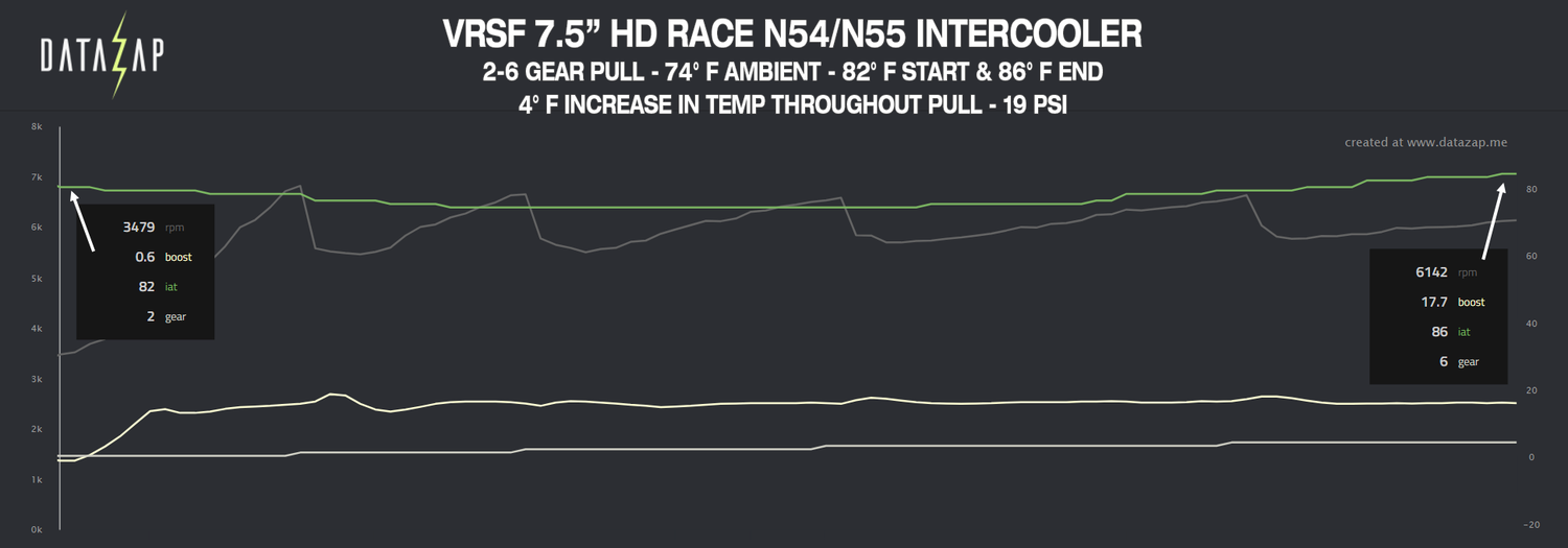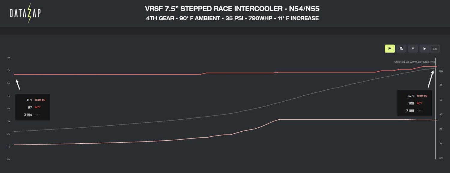 Replace your overheated factory intercooler with the VRSF 7.5″ Race Intercooler Kit to get the most out of your N54 or N55. We designed this kit to be one of the best performing intercoolers available for your BMW with special attention to quality and performance while maintaining a reasonable price point. Our intercoolers allow for higher HP gains, mainly due to their ability to keep intake temps down while preventing heat soak which is a common problem with the factory intercooler. This results in more power and increased reliability with reduced chances of pre-detonation & knock.